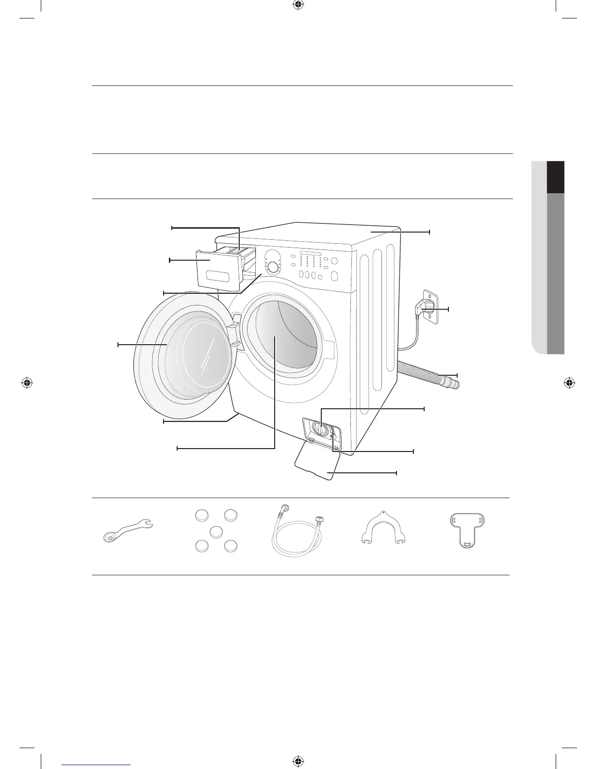 Pakk vaskemaskinen nøye ut og sørg for at du har mottatt alle delene som vises nedenfor.