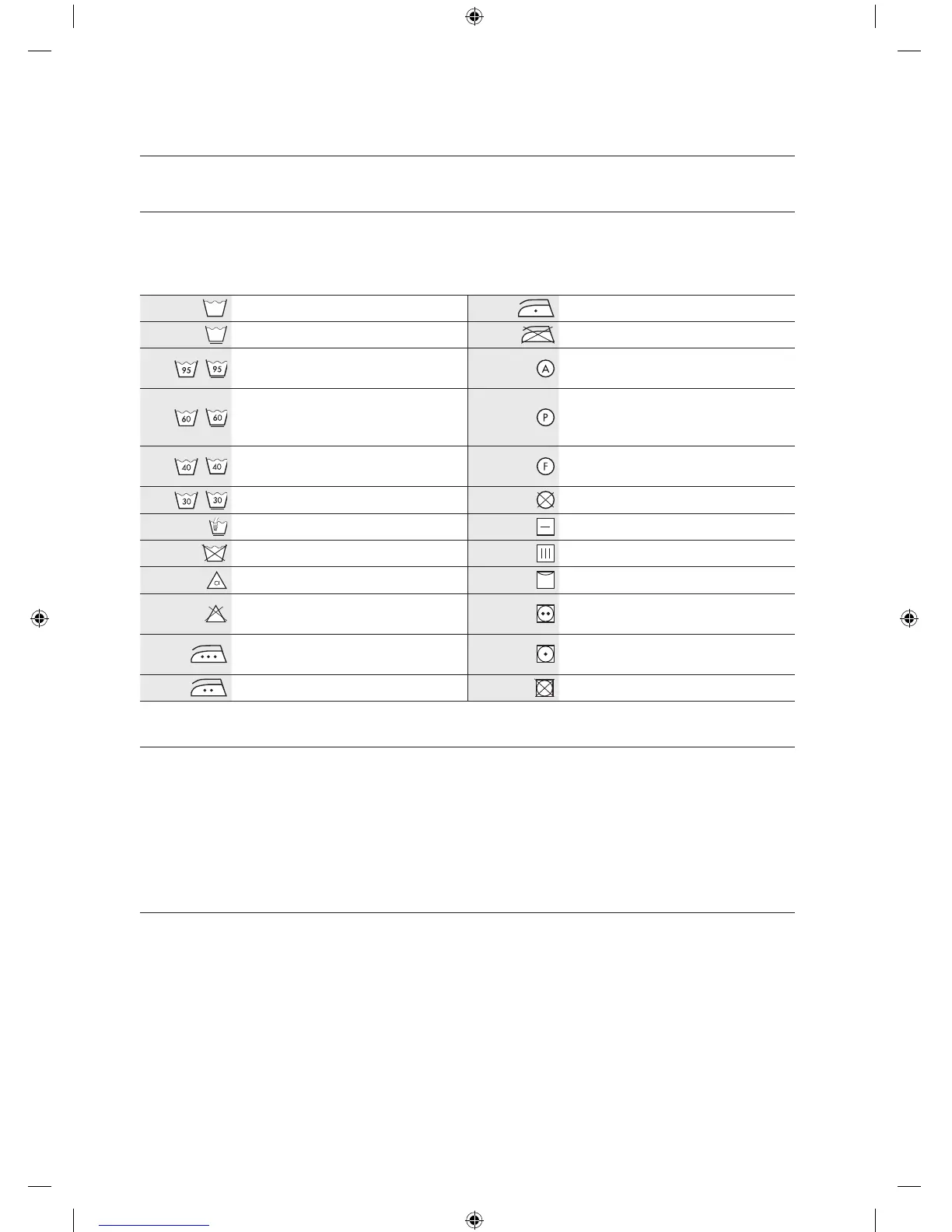 Følgende symboler gir veiledning om tekstilpleie. Etikettene inkluderer fire symboler i denne rekkefølgen:
