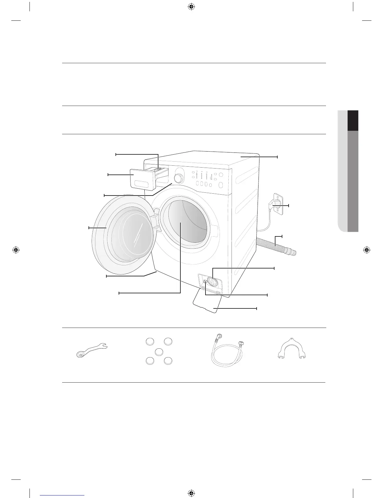 Pak forsigtigt alle dele til vaskemaskinen ud, så du er sikker på at have modtaget alle nedenfor viste dele.
