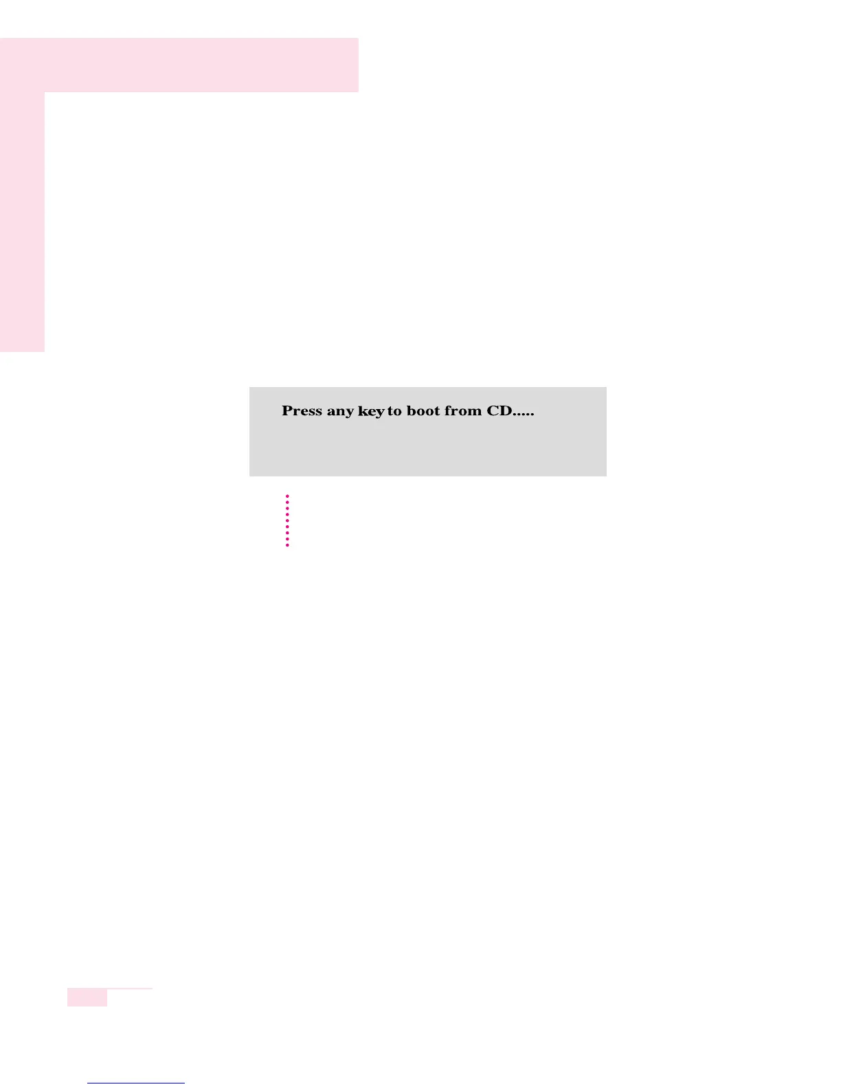 lation, restart the system, and the message °∞Press any key to boot from CD” is