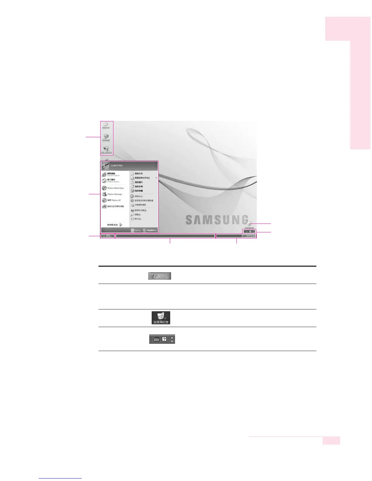 The Desktop is the working area on the computer. It consists of the large workspace,