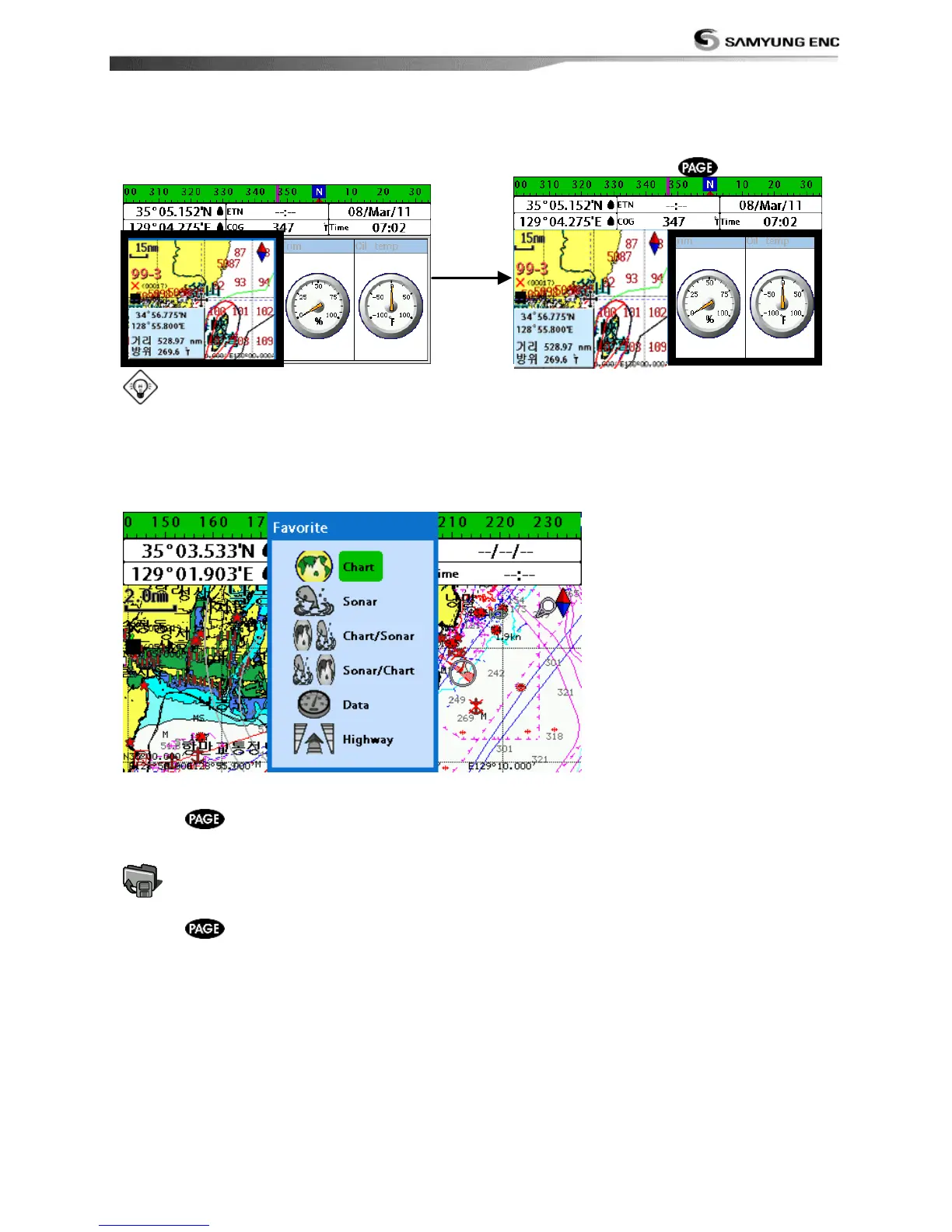 can be saved. Also each favorite display can have data bar and compass.