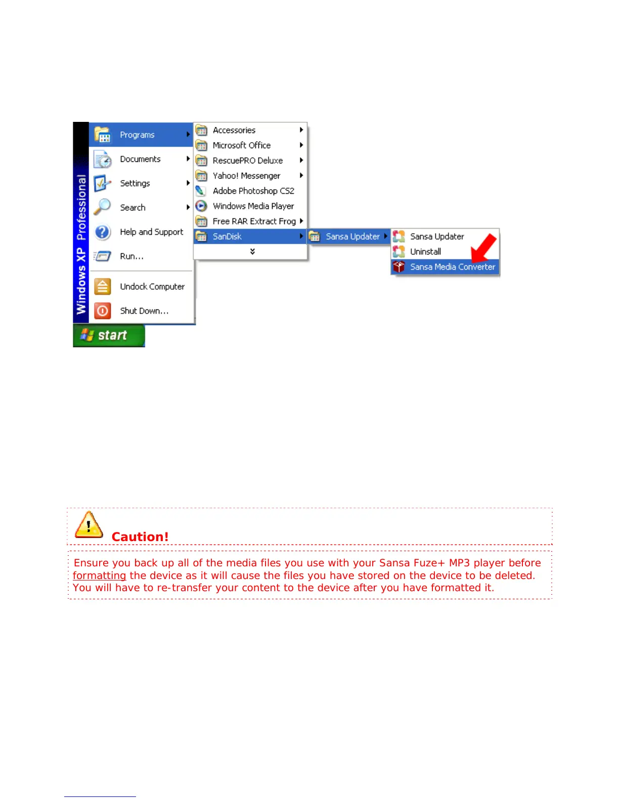 Click Start then go to Programs > SanDisk > Sansa Updater > Sansa Media