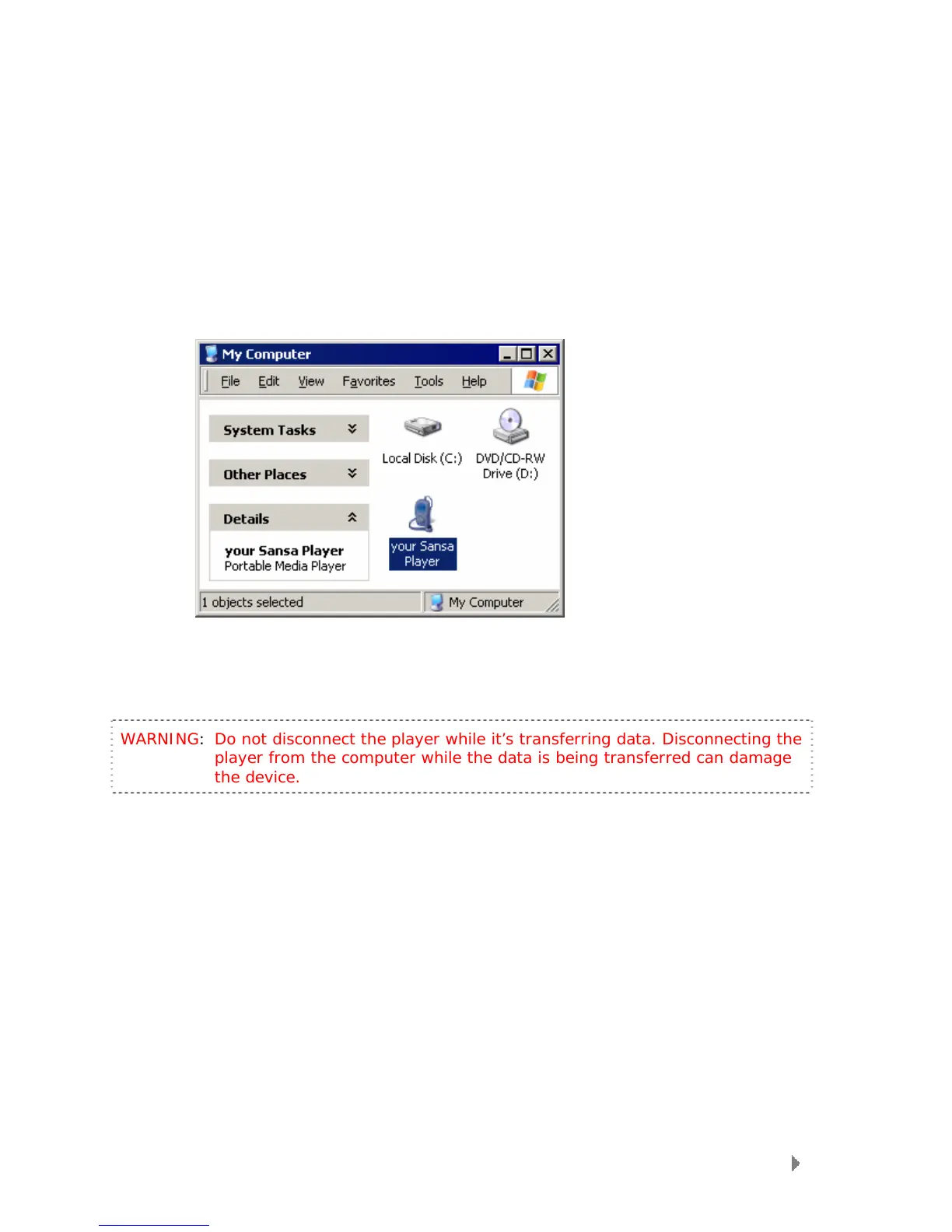WARNING: Do not disconnect the player while it’s transferring data. Disconnecting the