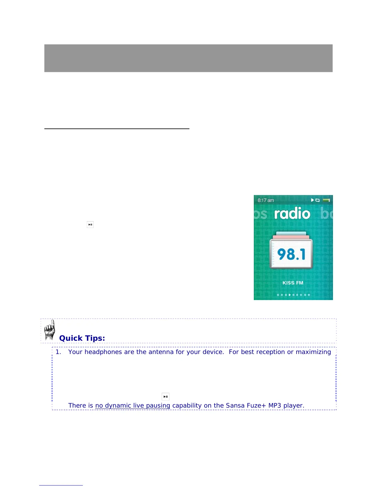 Your Sansa Fuze+ player includes an integrated FM radio for listening to live broadcast FM