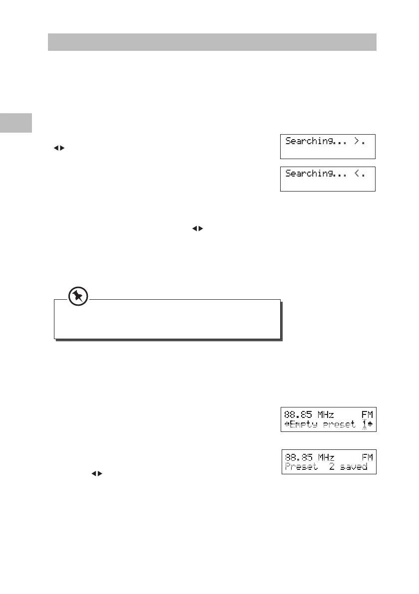 Søke etter FM-stasjoner manuelt. Trykk -knappene gjentatte ganger til ønsket frekvens