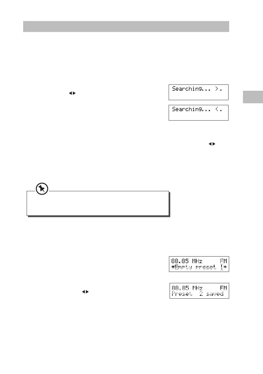 Låter dig söka manuellt efter FM-stationer. Tryck upprepade gånger på knapparna tills