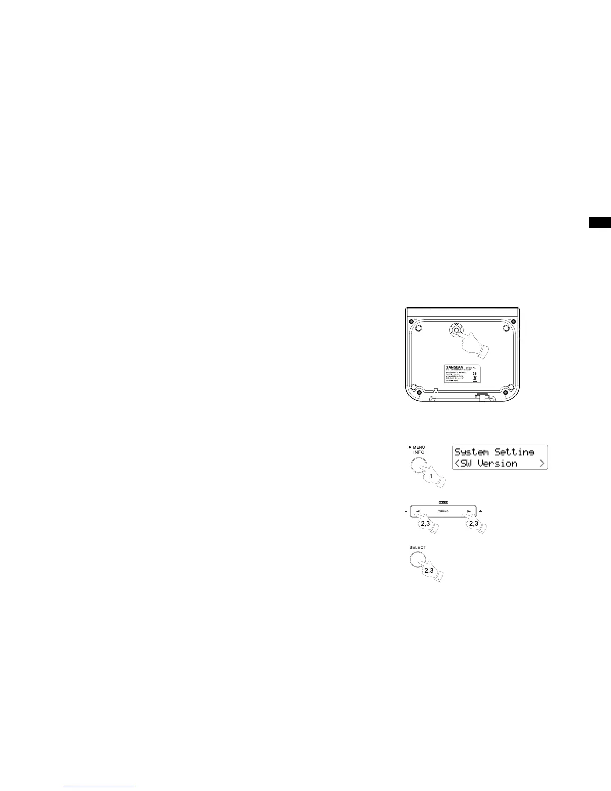 3. Press the Tuning up / down button until ‘SW version’ is shown on the display. Press the Select