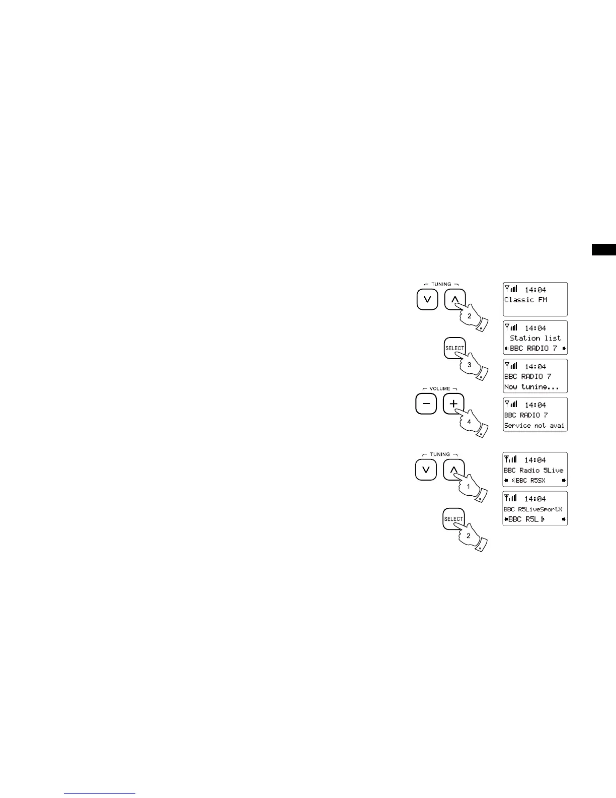 2. Press the Tuning Up/Down buttons to scroll through the list of available stations.