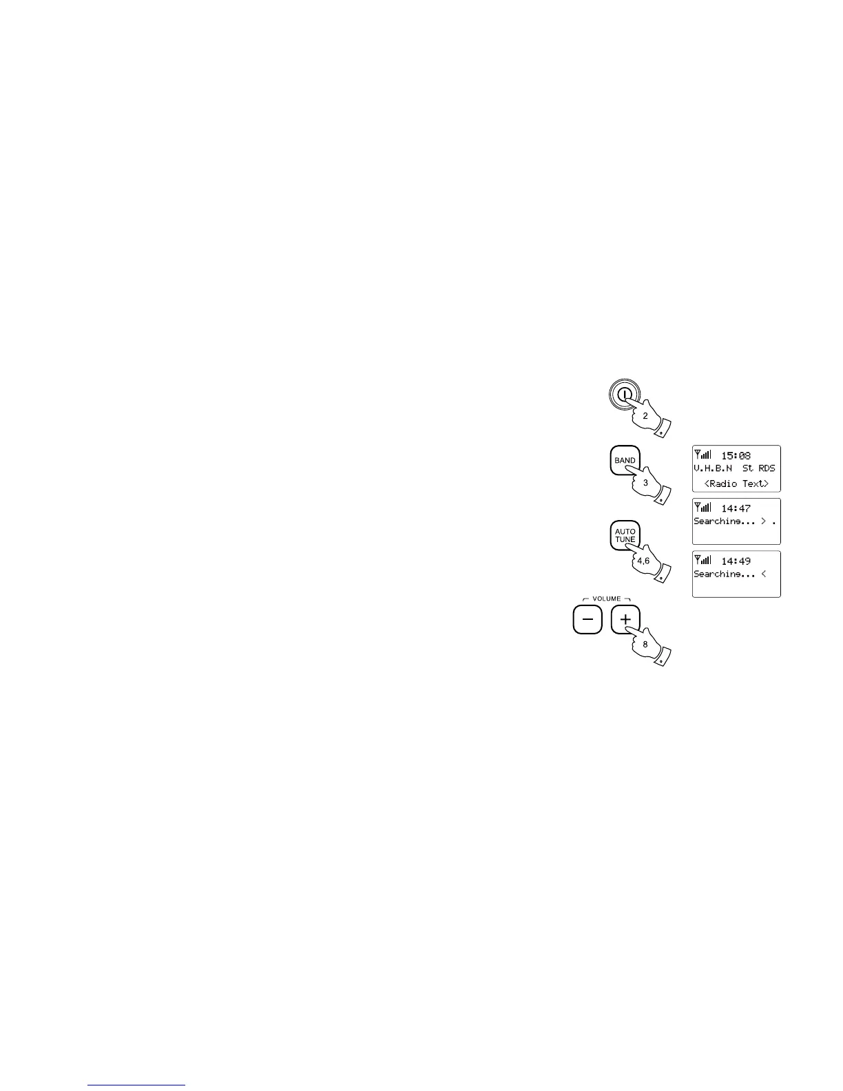 6. Houd Auto tune ingedrukt om de FM band van hoog naar beneden te scannen. (hoge