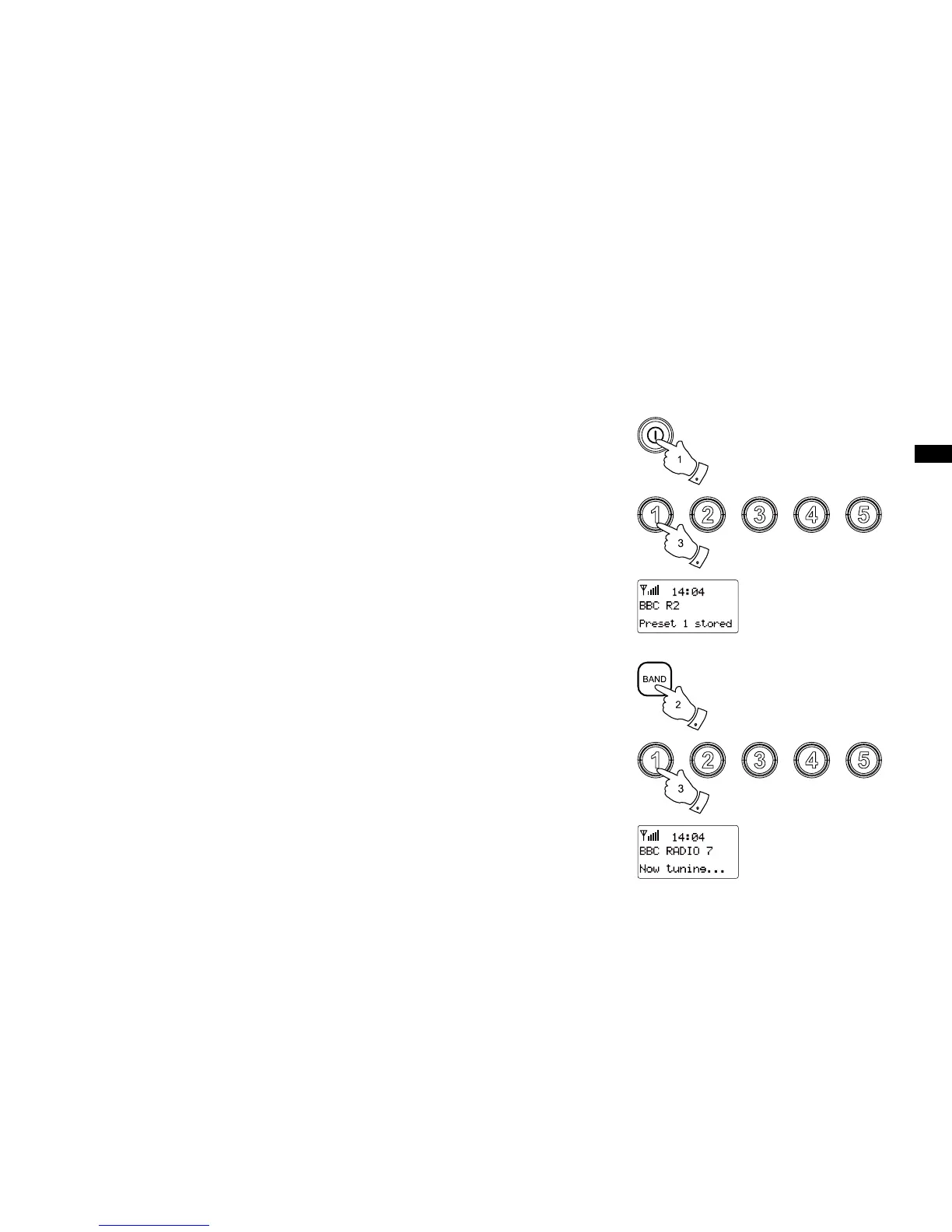“Preset 1 stored”. De zender wordt opgeslagen in het gekozen nummer van de voorkeurknop.