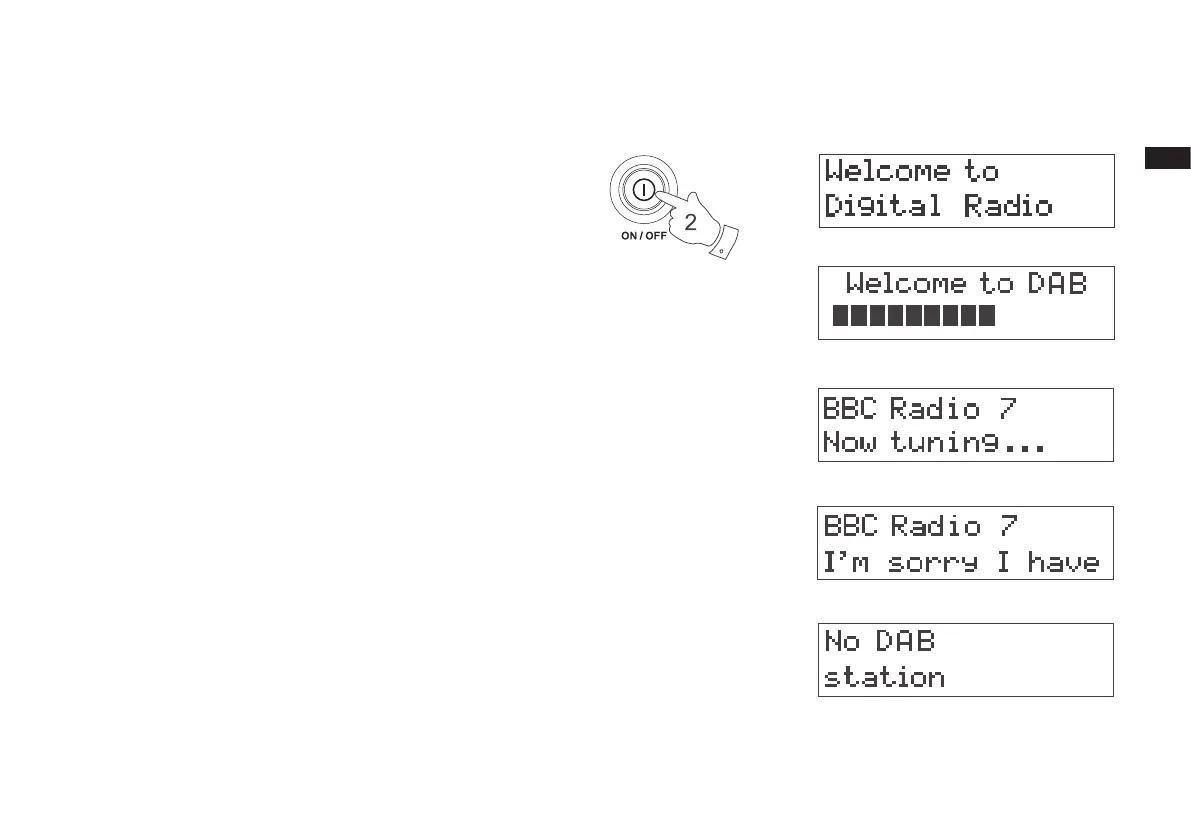 2. Druk op de On/Off-knop om de radio aan te zetten. Het scherm toont