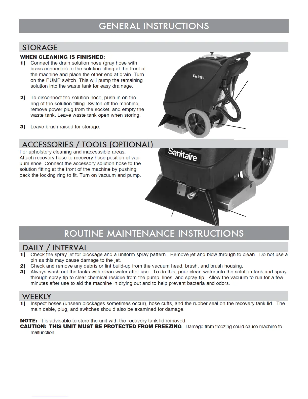 Sanitaire SC6095A - Storage and Maintenance; Storage Procedures; Optional Accessories; Routine Maintenance