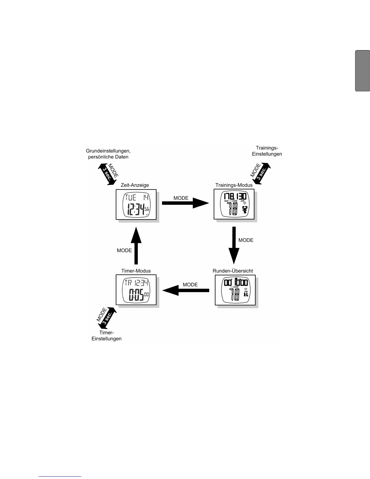 Die Bedienung der Pulsuhr ist in Hauptmenüs aufgebaut. Von den