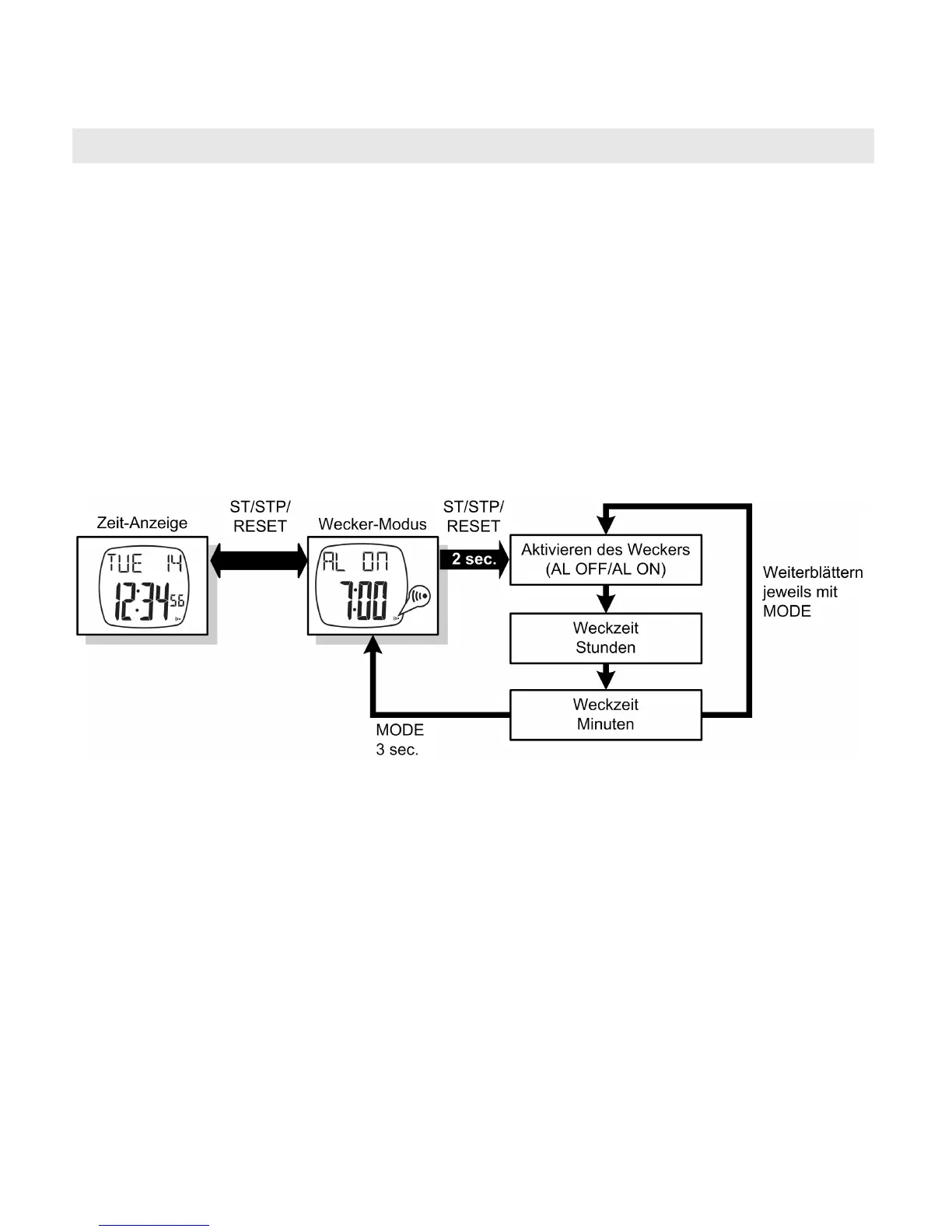 ST/STP/RESET. Daraufhin wird die eingestellte Weckzeit angezeigt
