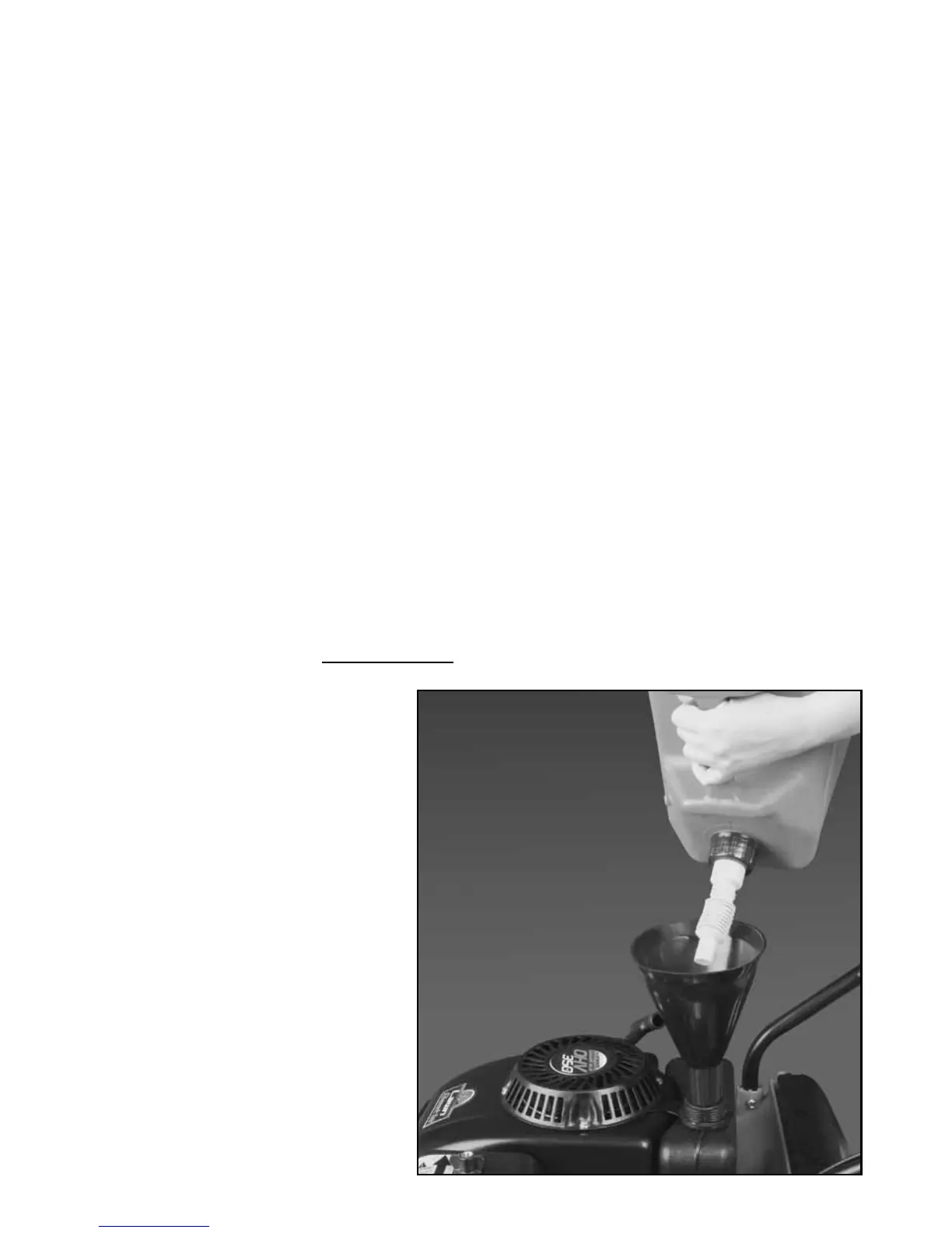 container beneath the mower’s oil ller pipe and tilt the mower onto its side with the air