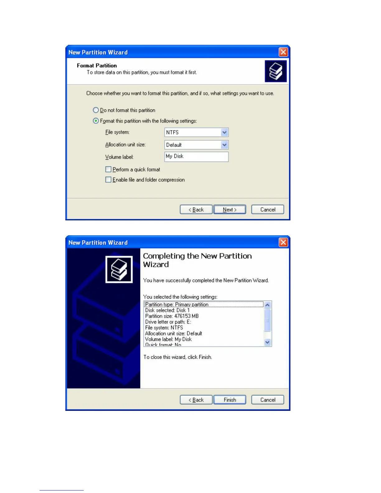 8. Name and format the partition and click Next.