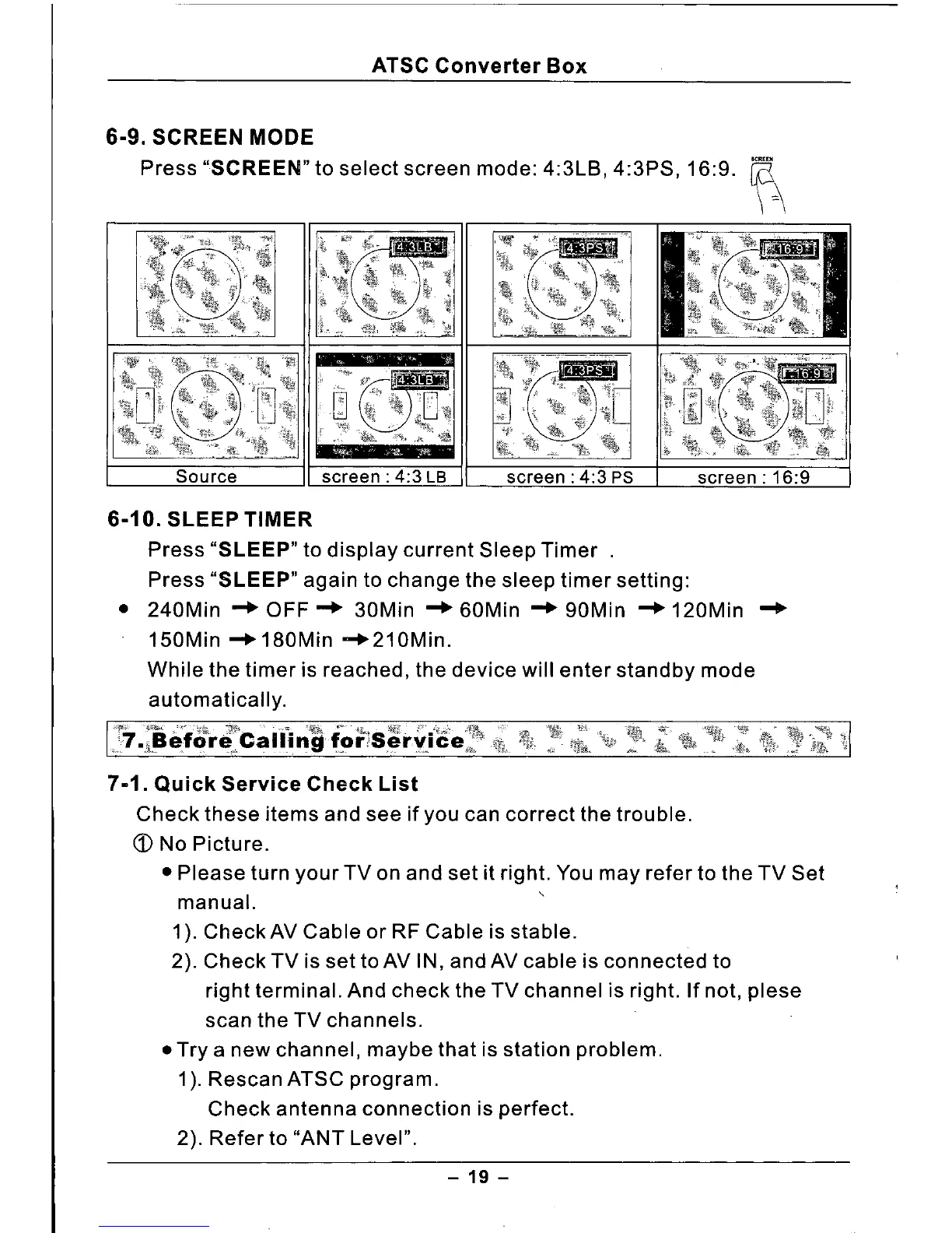 Press "SCREEN" to select screen mode: 4:3LB, 4:3PS, 16:9.