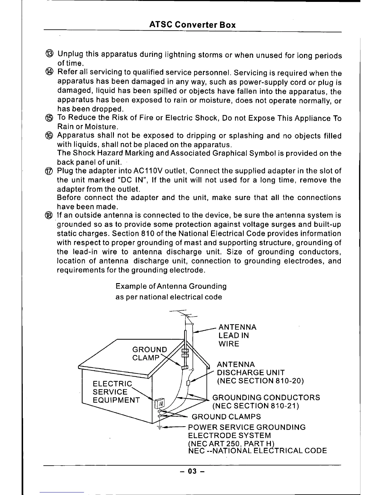 the lead-in wire to antenna discharge unit. Size of grounding conductors,