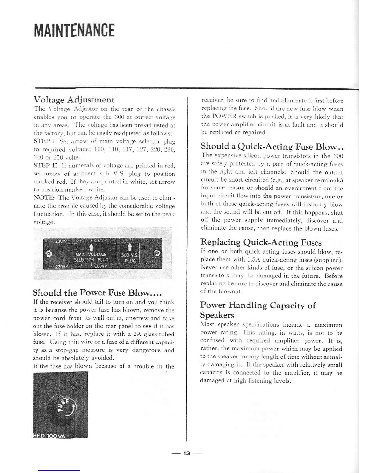 Sansui 300 - Maintenance: Power and Speaker Management; Voltage Adjustment Procedure; Main Power Fuse Replacement; Quick-Acting Fuse Troubleshooting