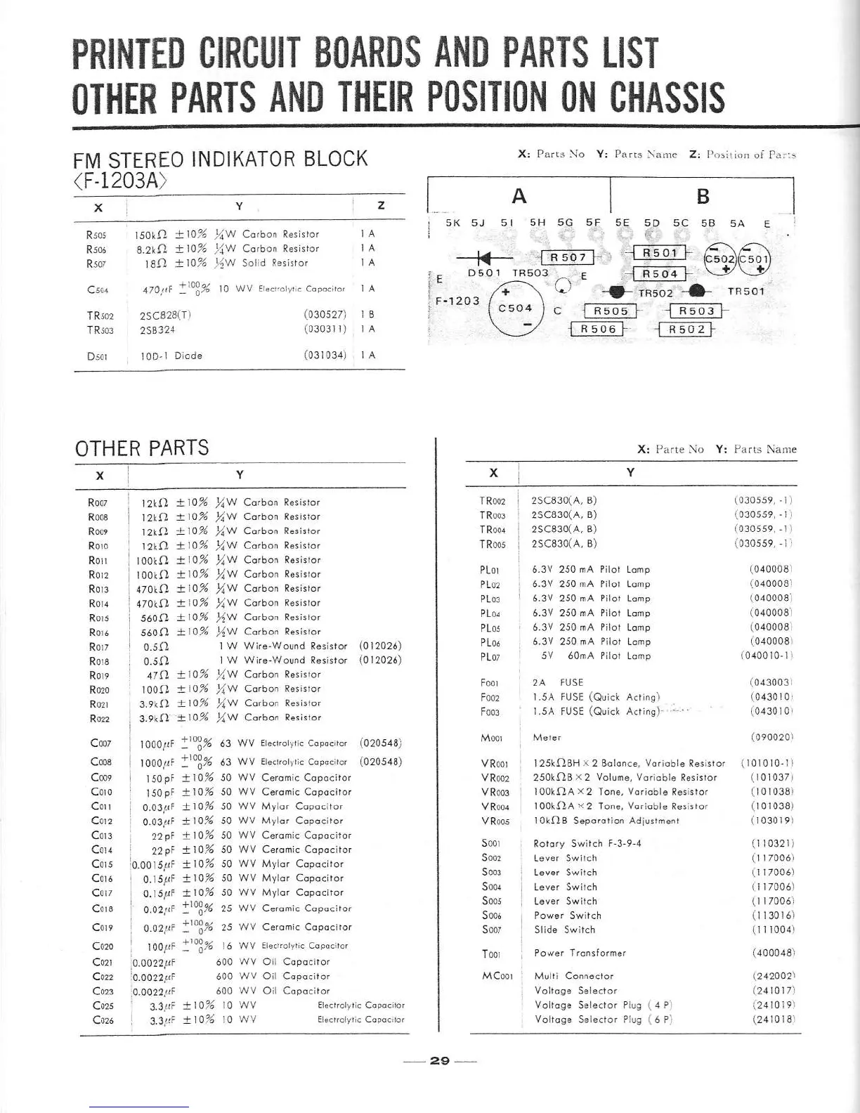 Sansui 300 - Printed Circuit Boards: FM Stereo Indicator and Other Parts; FM Stereo Indicator Block F-1203 A Parts List; Other Parts and Chassis Positions