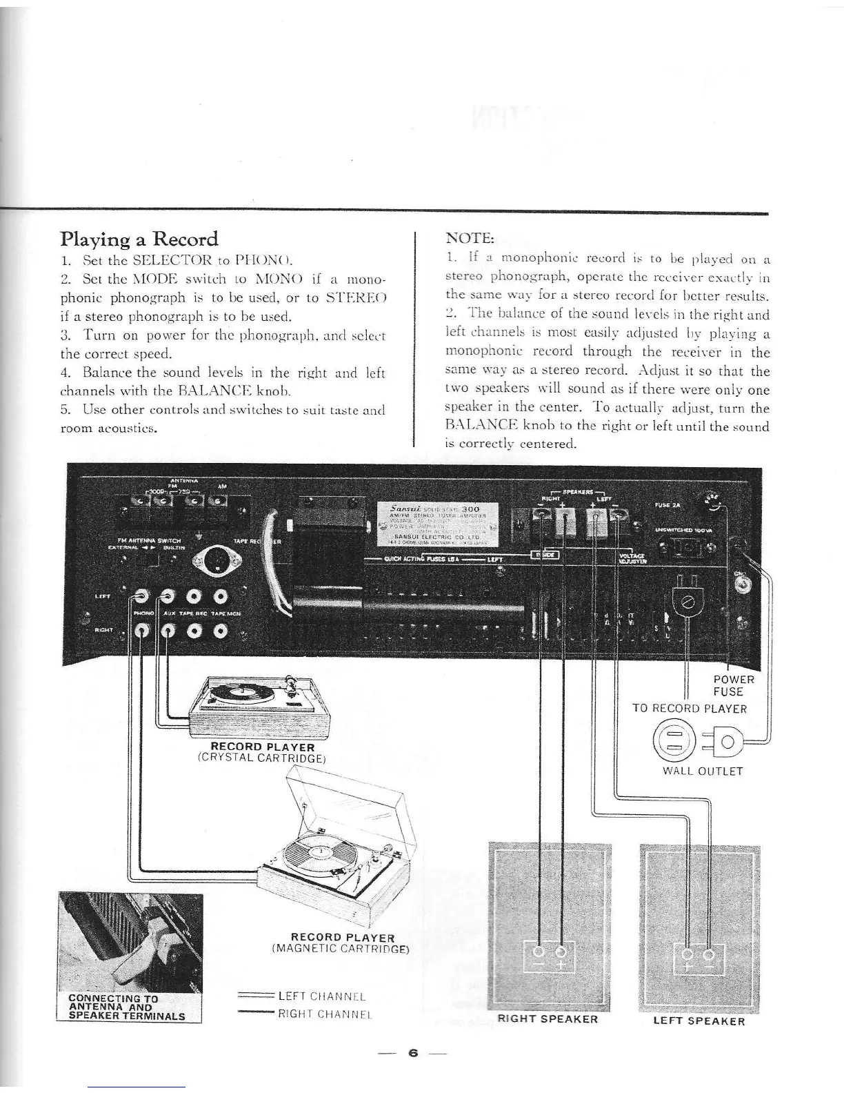 Sansui 300 - Playing a Record; Record Playback Procedure; Monophonic Record Playback Notes