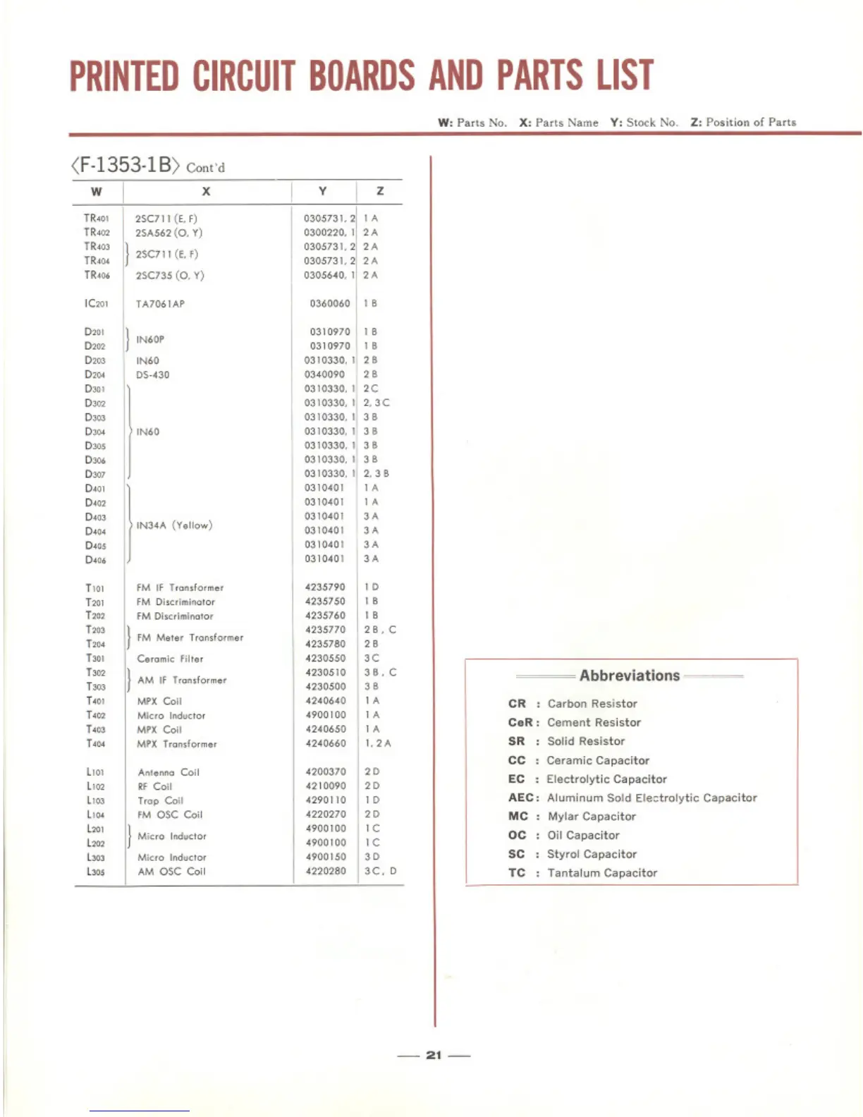 Sansui 310 - Printed Circuit Board Parts List: Tone Control, Power Amp, Power Supply Block