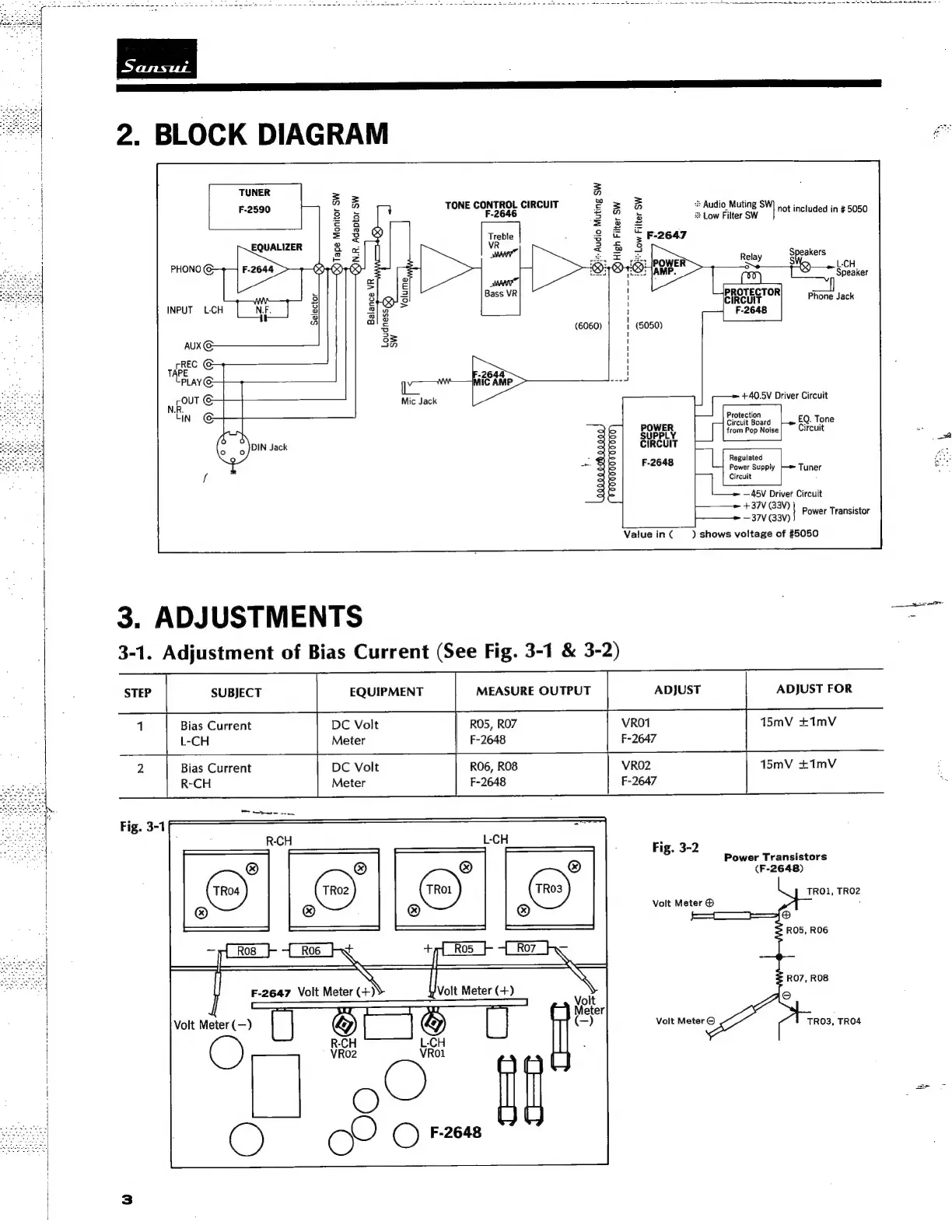 Sansui 5050 - Sansui Receiver Block Diagrams; Overall System Block Diagram; Sansui Receiver Adjustments; Bias Current Adjustment Procedure