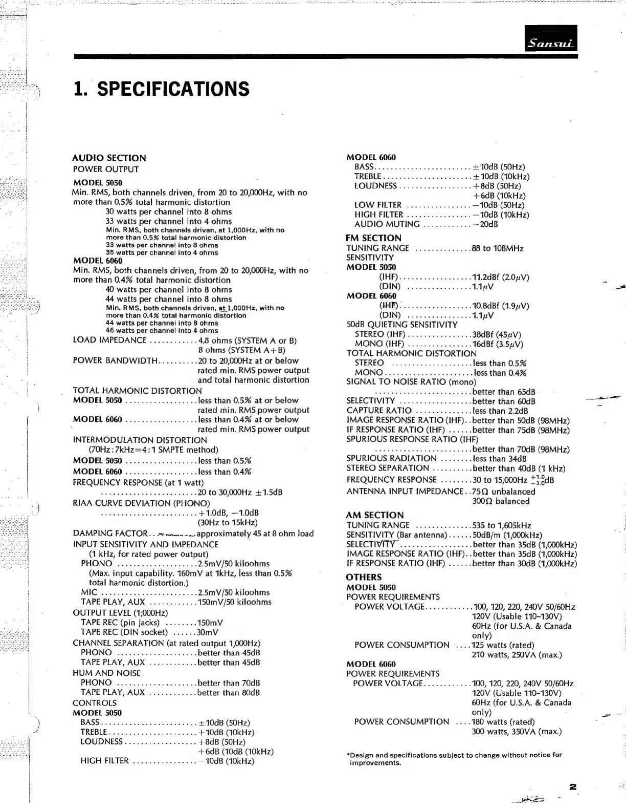 Sansui 6060 - 1. SPECIFICATIONS; AUDIO SECTION; FM SECTION; AM SECTION
