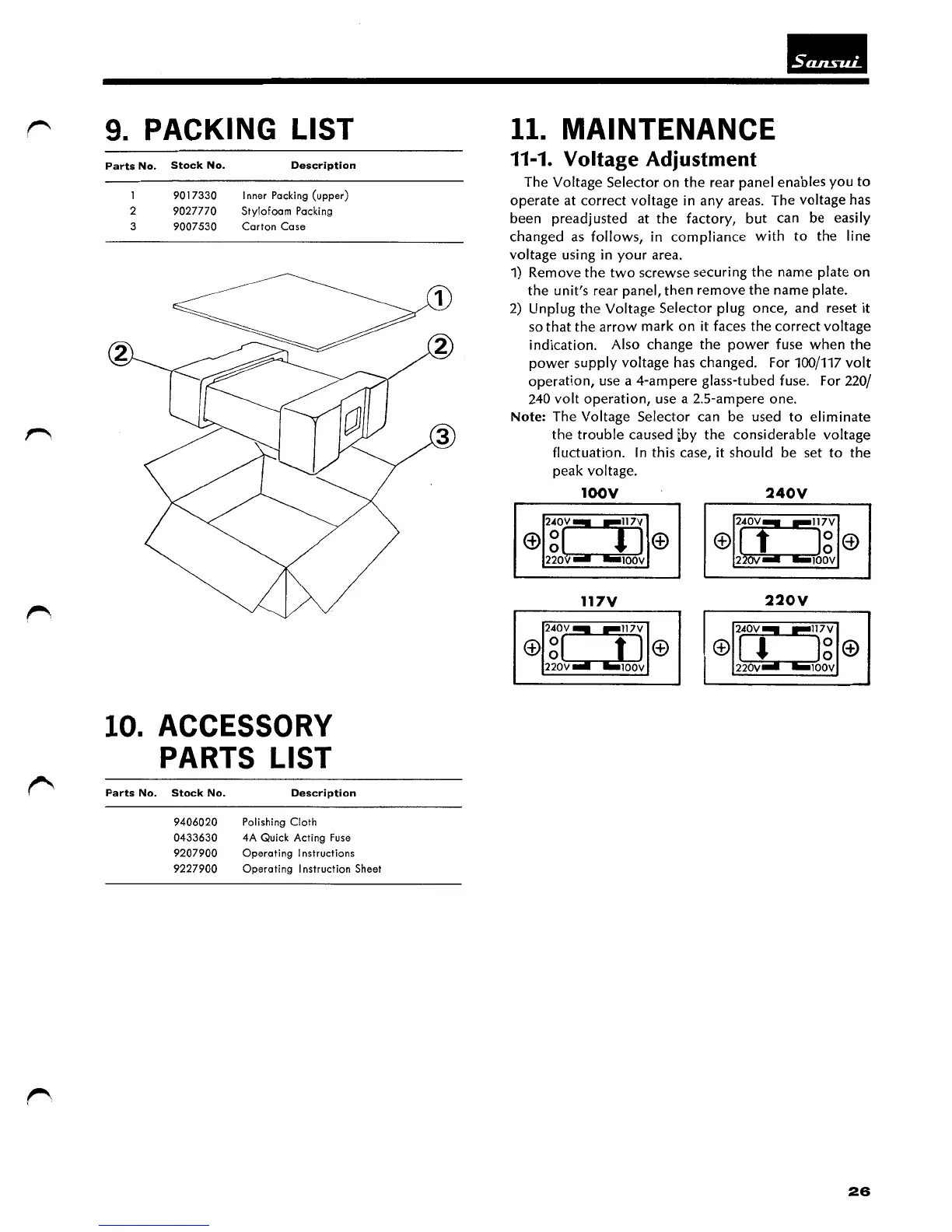 Sansui 661 - Packing List; Accessory Parts List; Maintenance; Voltage Adjustment Guide