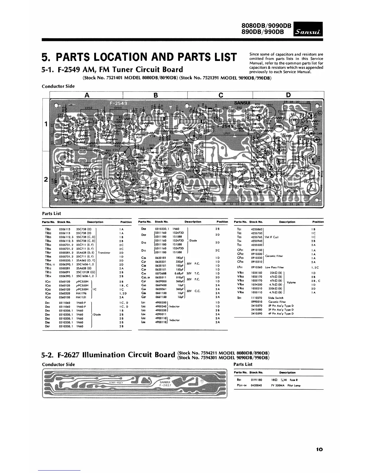 Sansui 8080DB - 5. CIRCUIT BOARD LISTS AND DIAGRAMS; 5-1. F-2549 AM, FM Tuner Circuit Board; 5-2. F-2627 Illumination Circuit Board