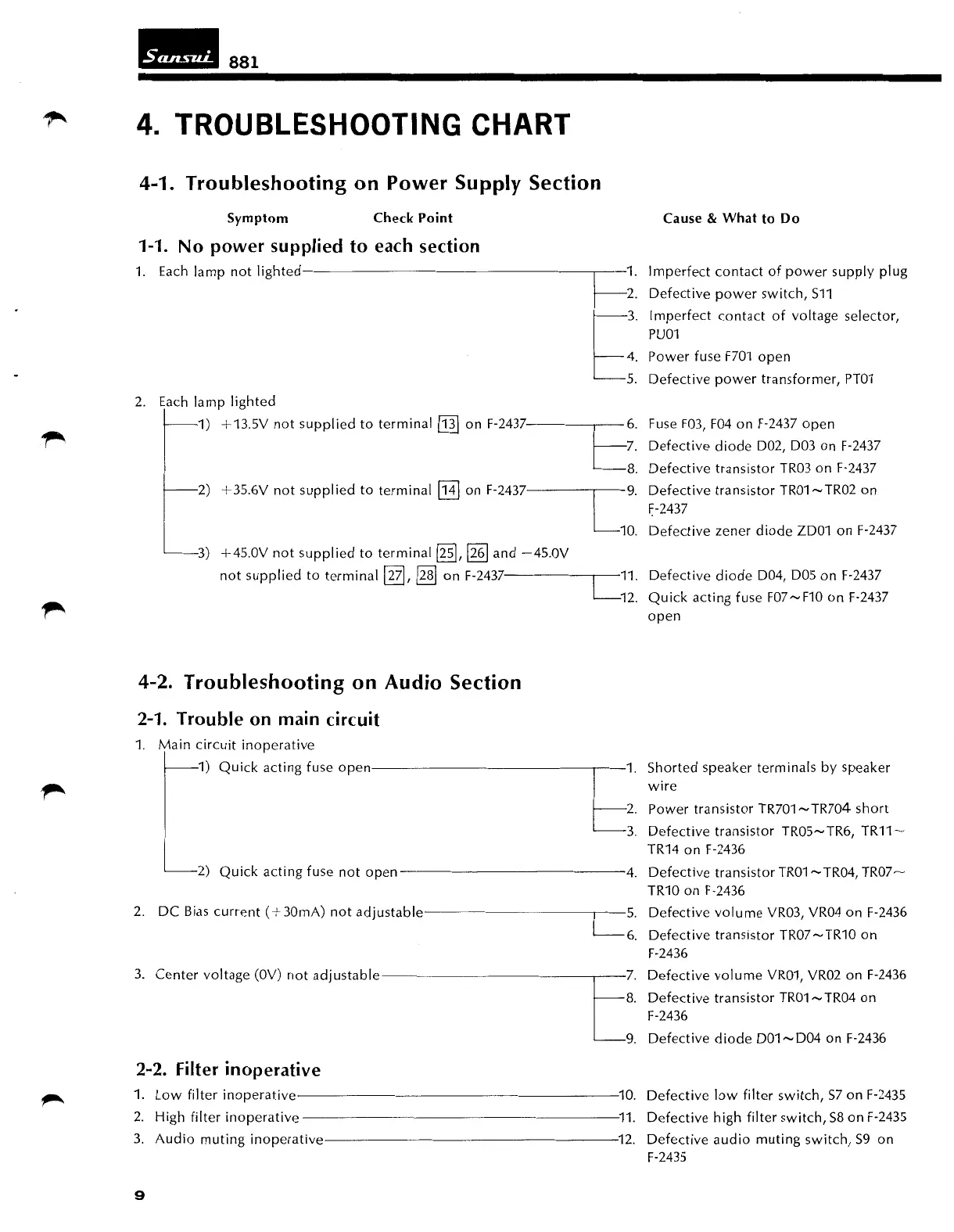 Sansui 881 - Sansui 881 Troubleshooting Guide; Power Supply Troubleshooting; Audio Section Troubleshooting