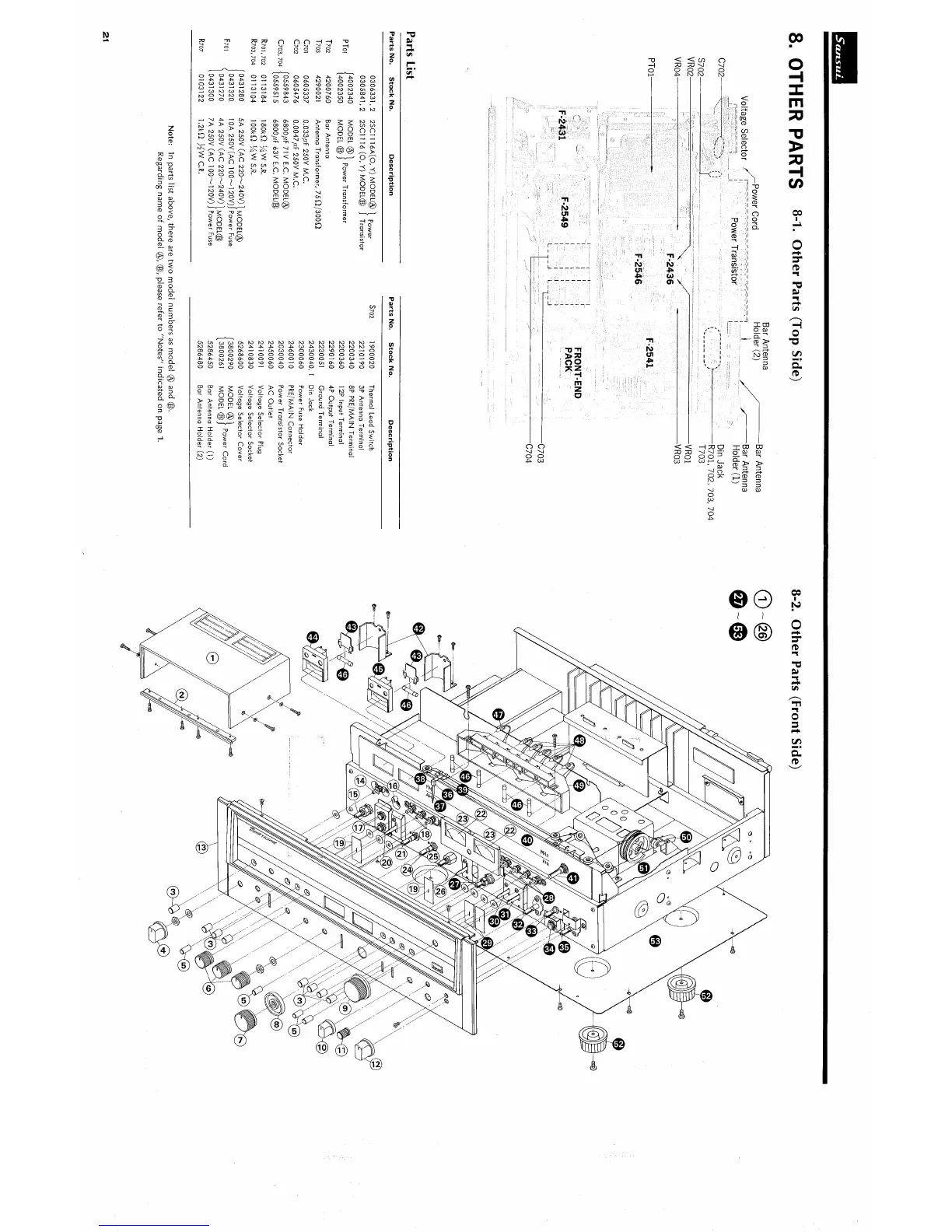 Sansui 890 - OTHER PARTS; 8-1. Other Parts (Top Side); 8-2. Other Parts (Front Side)
