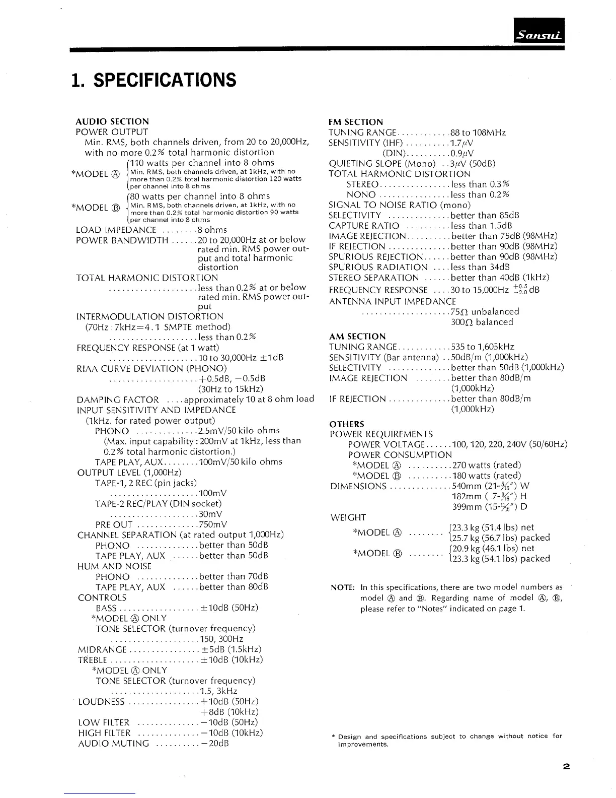 Sansui 890 - SPECIFICATIONS; AUDIO SECTION; FM SECTION; AM SECTION