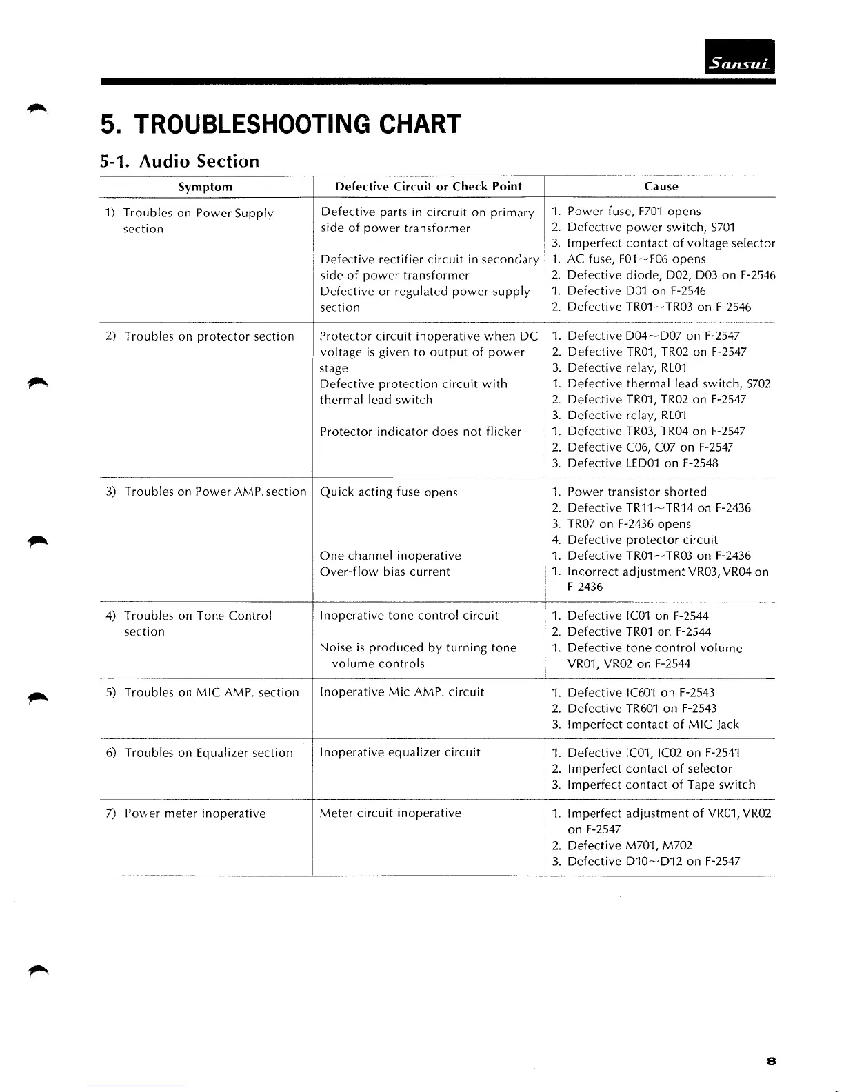 Sansui 9090 - Sansui Receiver Troubleshooting Guide; Audio Section Troubleshooting Symptoms and Causes