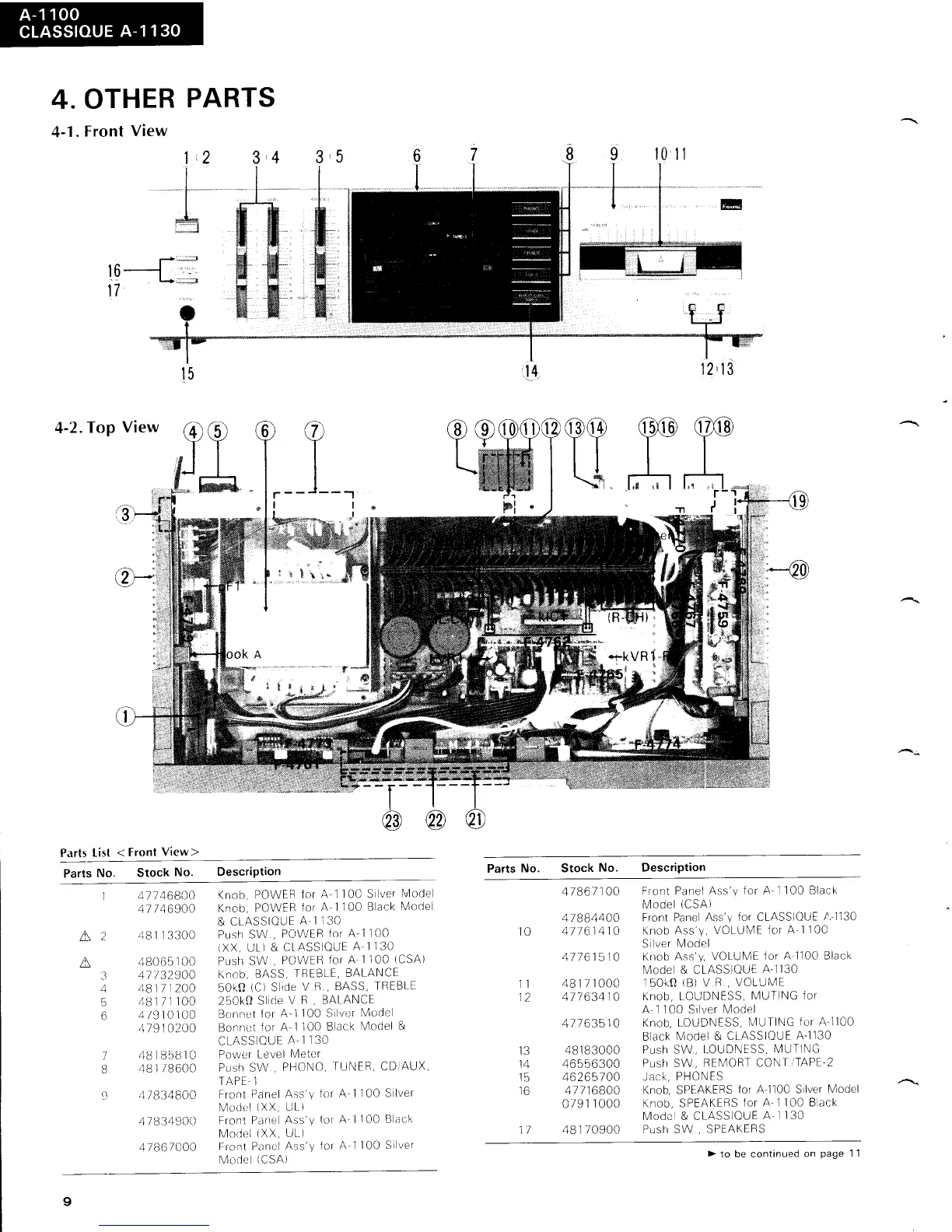 Sansui A-1100 - Other Parts; Front View Parts; Top View Parts