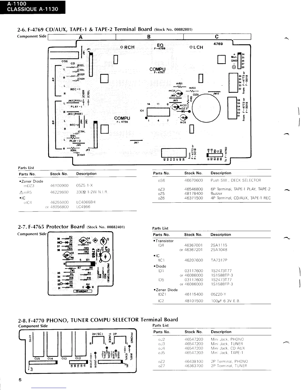 Sansui A-1100 - Parts Location and Parts List; F-4769 CD;AUX, TAPE-1 & TAPE-2 Terminal Board; F-4765 Protector Board; F-4770 PHONO, TUNER COMPU SELECTOR Terminal Board