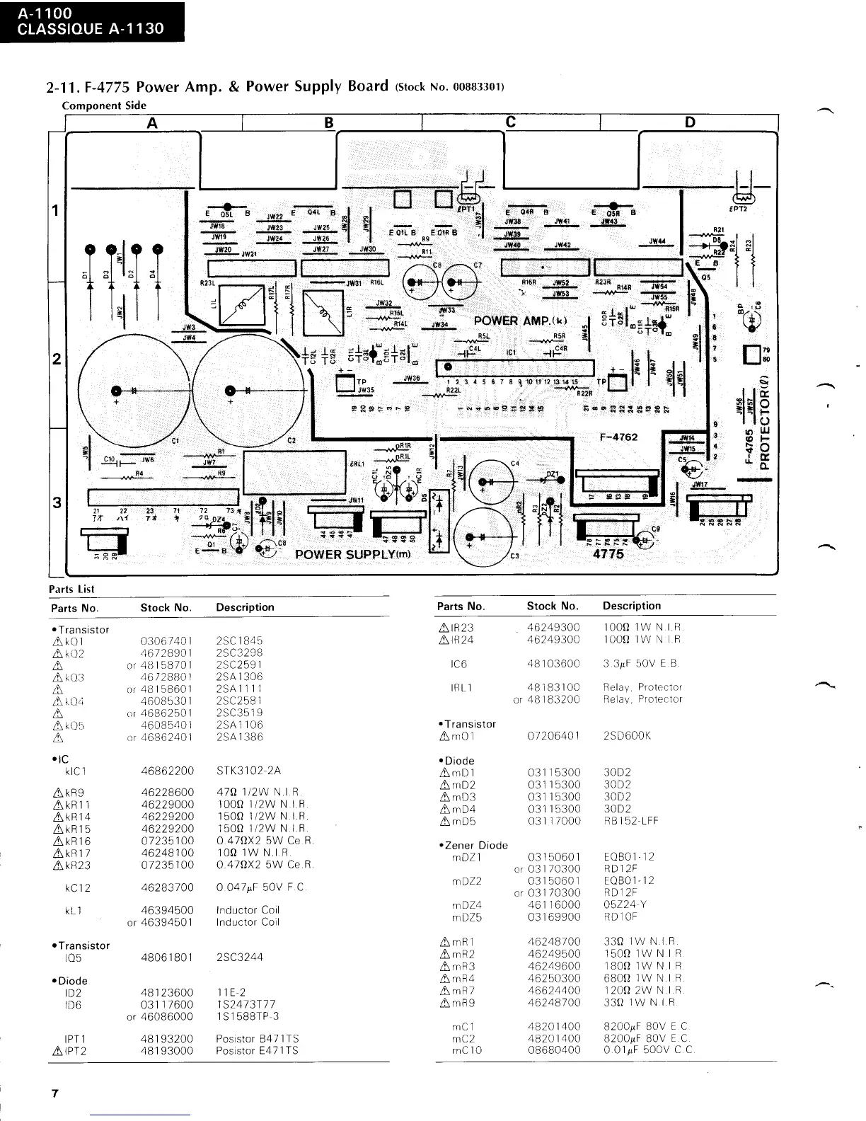 Sansui A-1100 - Parts Location and Parts List; F-4775 Power Amp. & Power Supply Board