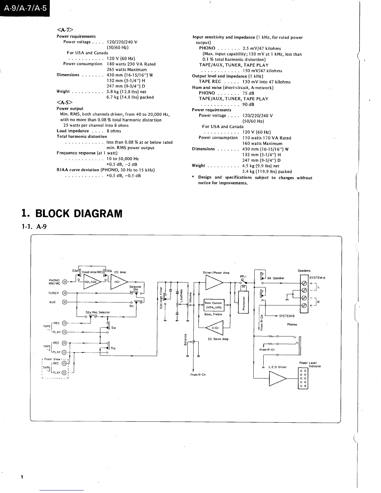 Sansui A-7 - Sansui A-5 Amplifier Specifications; BLOCK DIAGRAMS; Sansui A-9 Block Diagram