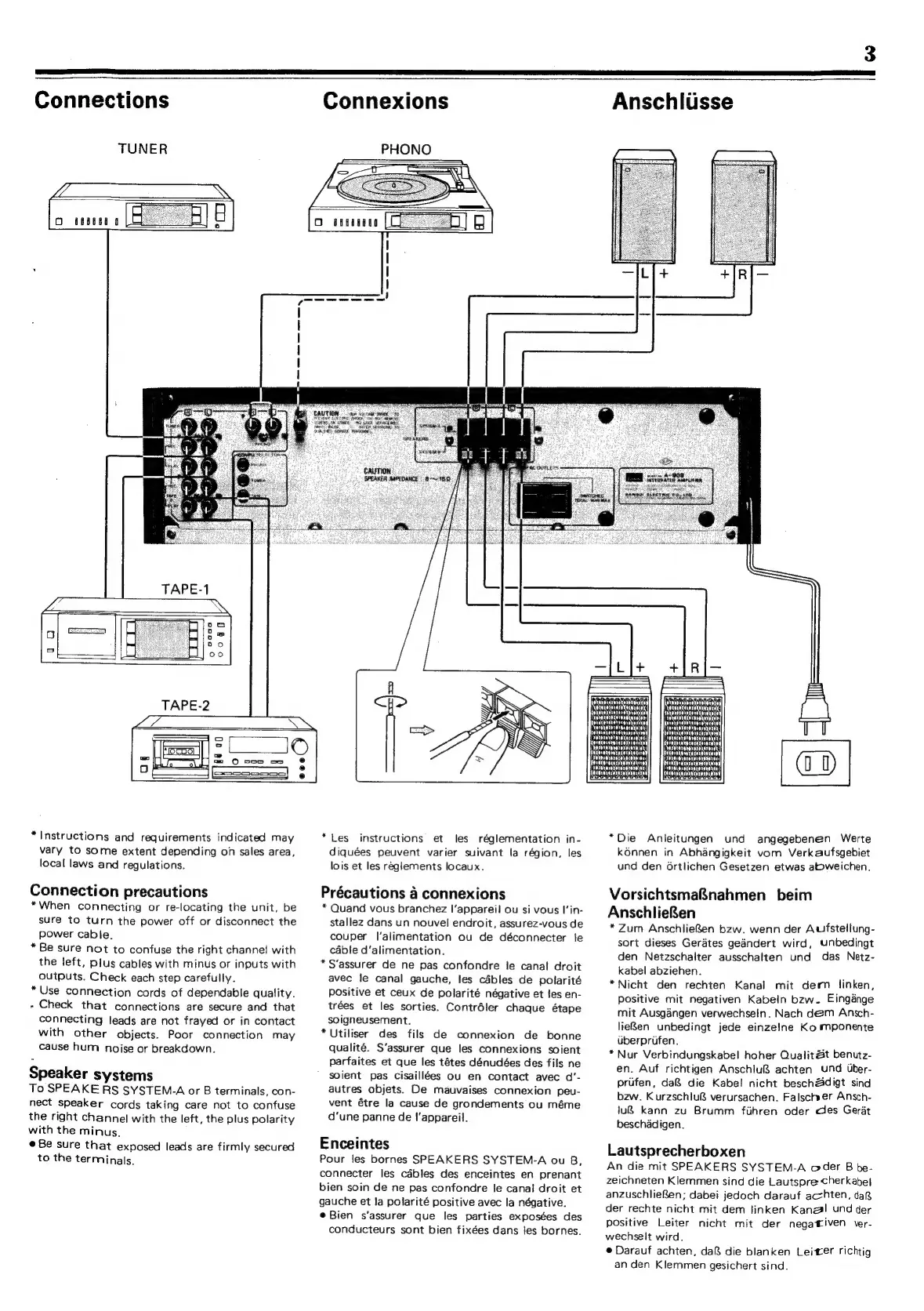 Sansui A-909 - Connections Guide; Connection Safety Precautions; Speaker System Connection Guide
