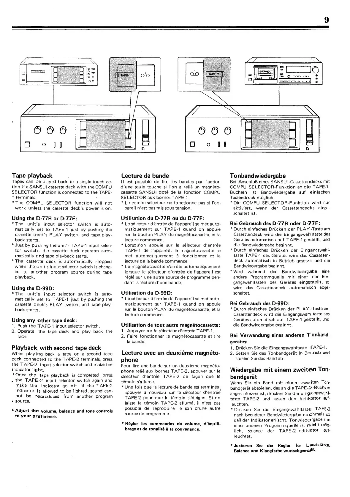Sansui A-909 - Tape Operations; Tape Playback Function; D-77 R;D-77 F Tape Playback; D-99 D Tape Playback