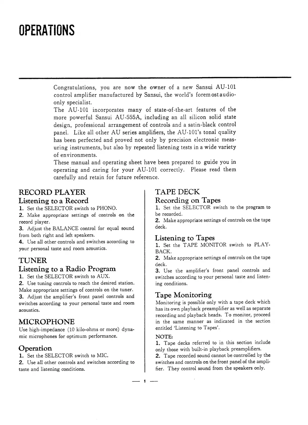Sansui AU-101 - OPERATIONS; Record Player Operation; Tuner Operation; Microphone Operation