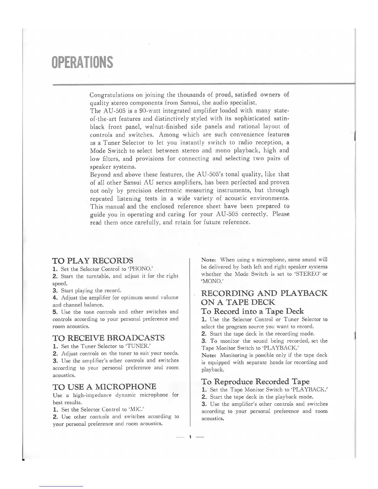 Sansui AU-505 - OPERATIONS; TO PLAY RECORDS; TO RECEIVE BROADCASTS; TO USE A MICROPHONE