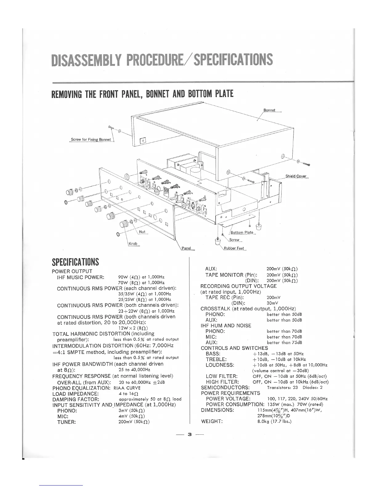 Sansui AU-505 - DISASSEMBLY PROCEDURE; REMOVING THE FRONT PANEL, BONNET AND BOTTOM PLATE; SPECIFICATIONS