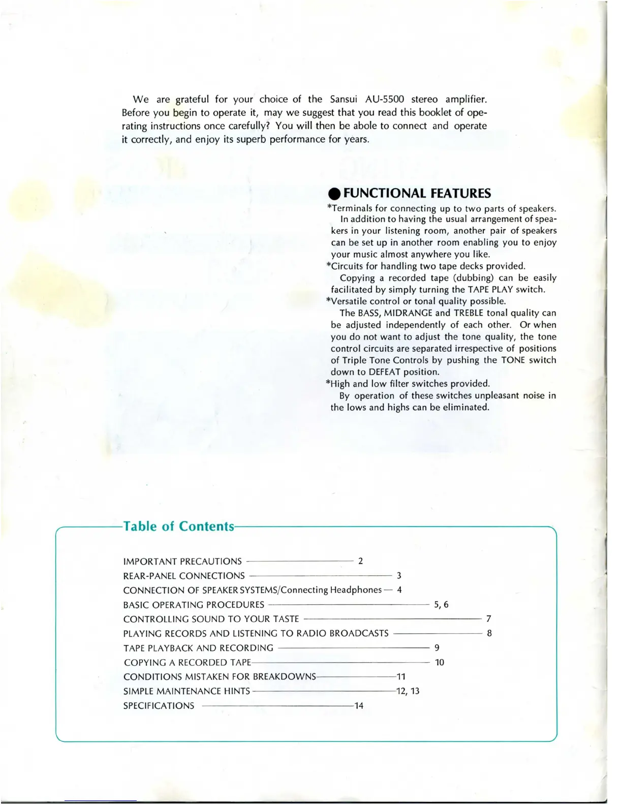 Sansui AU-5500 - Functional Features; Table of Contents