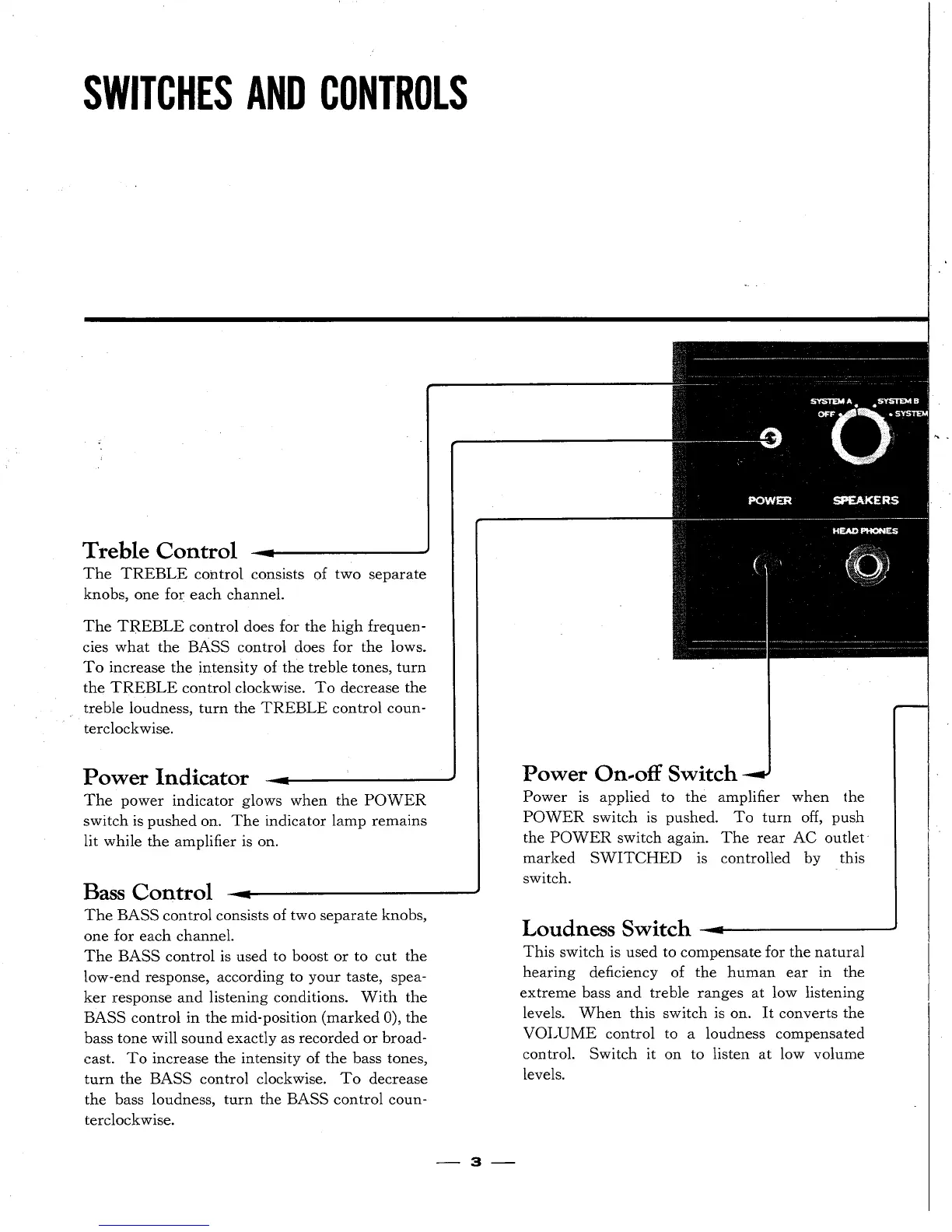 Sansui AU-555 - Switches and Controls; Front Panel Tone and Volume Controls; Power and Input Selection Controls