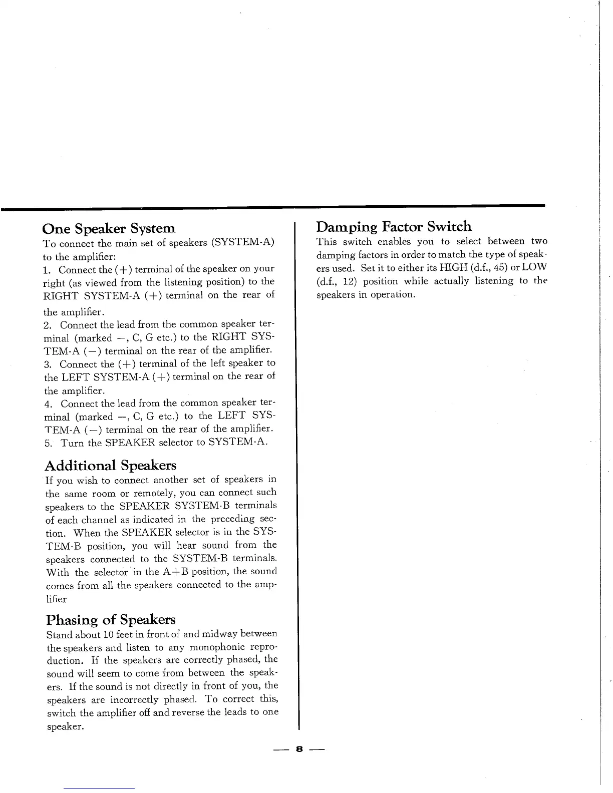 Sansui AU-555 - Speaker System Configuration; Speaker Phasing; Damping Factor Switch