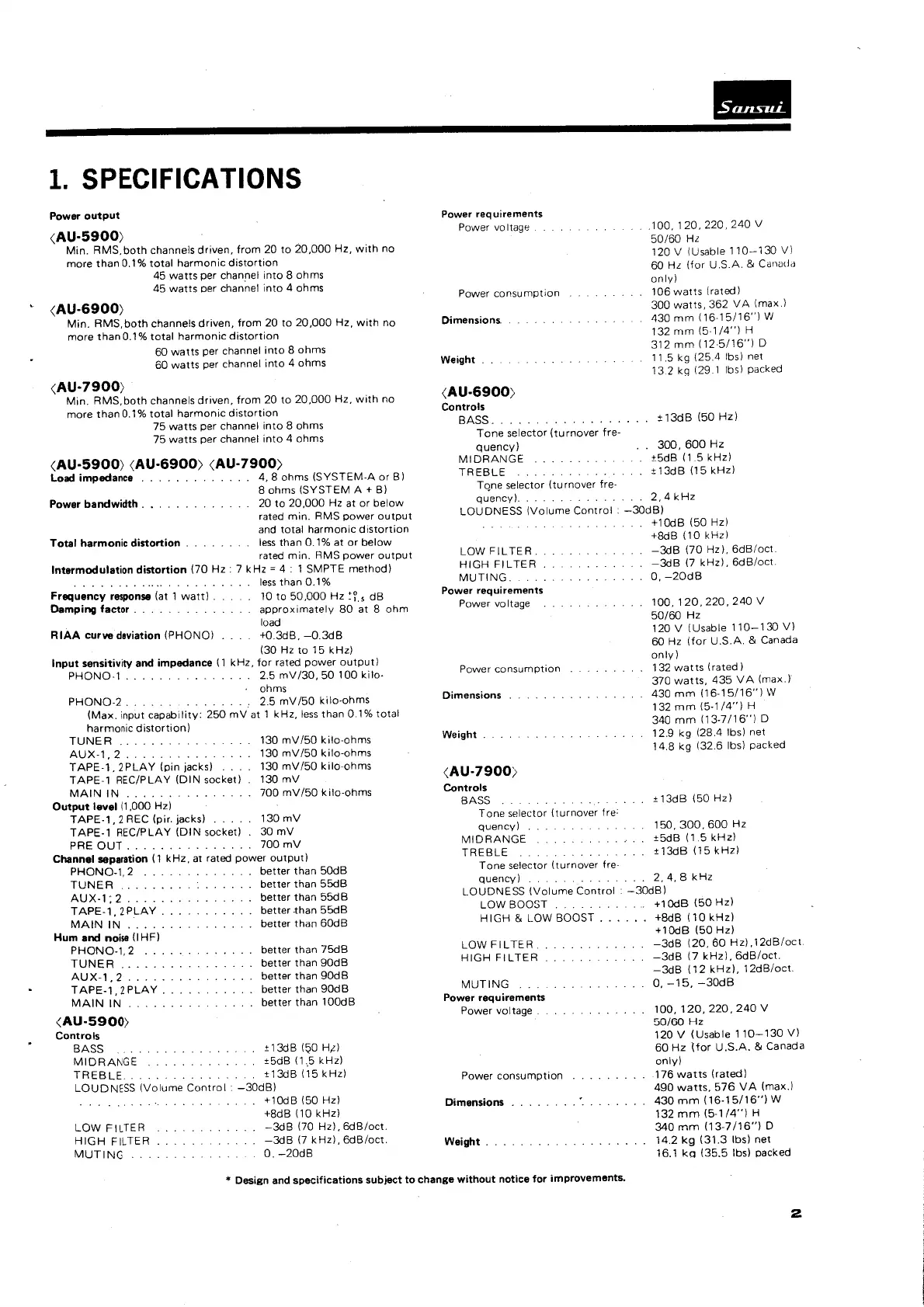 Sansui AU-5900 - 1. Specifications; Power Output Specifications; Input and Output Specifications; Power Requirements and Dimensions