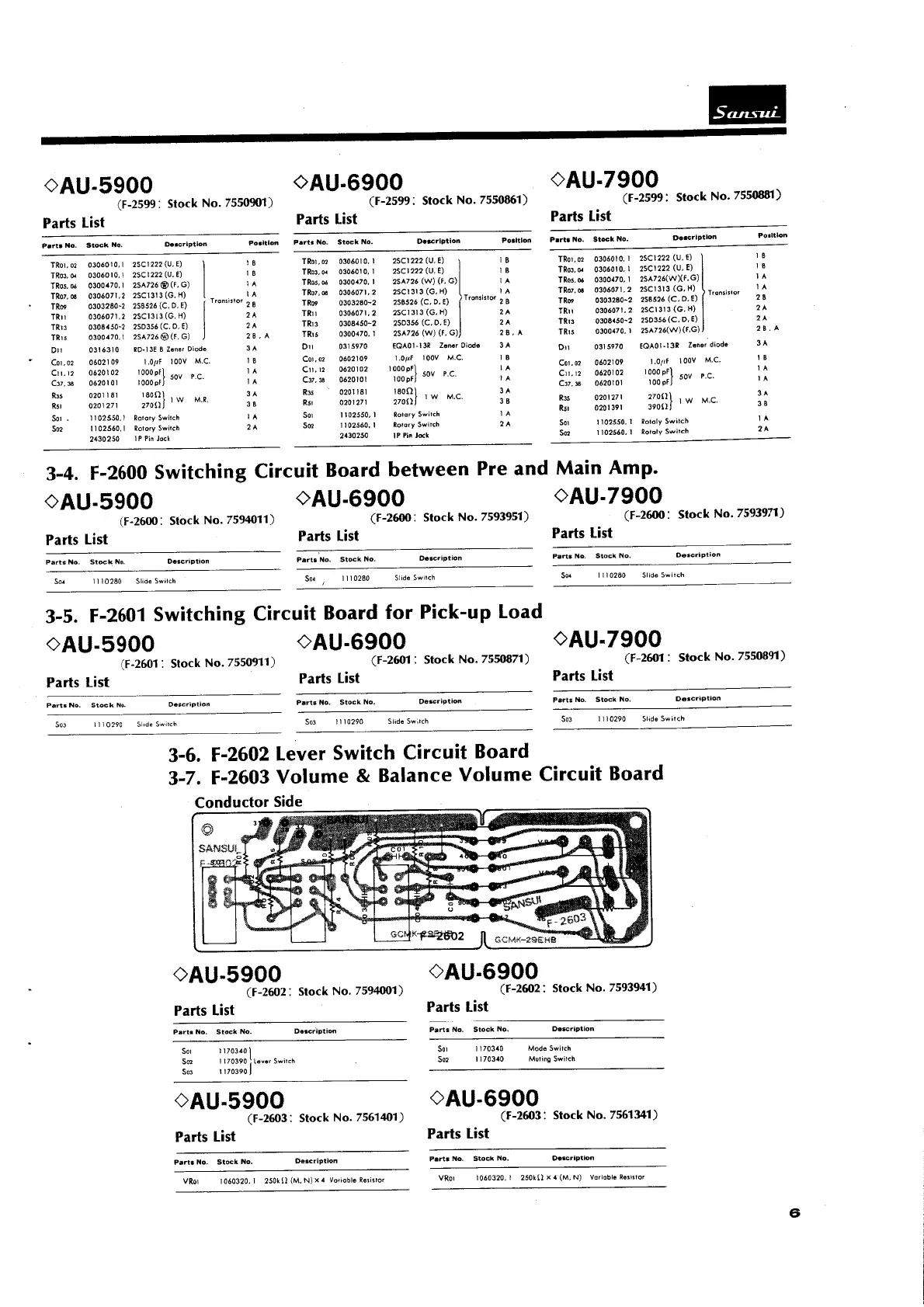 Sansui AU-5900 - 3-4. F-2600 Switching Circuit Board (Pre-Main Amp); 3-5. F-2601 Switching Circuit Board (Pick-up Load); 3-6. F-2602 Lever Switch Circuit Board; 3-7. F-2603 Volume & Balance Circuit Board