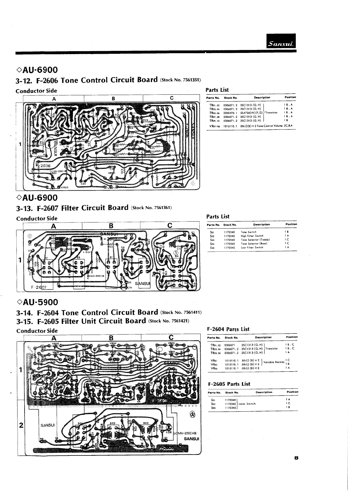 Sansui AU-6900 - 3-12. F-2606 Tone Control Circuit Board; 3-13. F-2607 Filter Circuit Board; 3-14. F-2604 Tone Control Circuit Board; 3-15. F-2605 Filter Unit Circuit Board